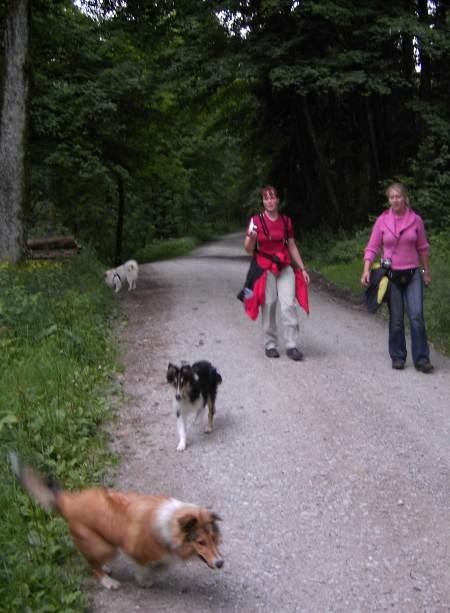 nachdem Ricky und unsere Sonntagsgäste Jessica und Tanja sich ja nun leider verpasst hatten, machten wir bei abnehmend schönem Wetter bis beginnendem Regen einen wirklich schönen Sonntagsspaziergang mit Dressur-Einlagen. Bei uns im Wald gibt es Holzstapel zum drüber laufen, Baumstümpfe für "Hopp und Sitz!", Röhren zum Durchkriechen und Gewässer zum Planschen und Schwimmen. Ich hatte Belana und Chandra bei. Alle 7 hätte ich höchstens angeleint führen können. Vor dem Spaziergang hatten Ballota und Arabelle kurz die Gelegenheit, mit Crispin und Quantino ein Stück zu laufen, zum Schluss holte ich Anjin raus zum gemeinsamen Essen gehen. Meine Jungs mussten auf den Abendspaziergang allein mit Frauchen warten. Quantino ist noch der gleiche gutmütige Dressur-Teddybär wie voriges Jahr. Crispin ist noch sehr zierlich und etwas kleiner und schmaler als Chandra, aber auch sehr hübsch geworden. Er hat eben den Englischen Typ. Seine gute Bindung zu Jessica war schön zu beobachten. Auch über sein fröhlich-freies Wesen freue ich mich. Belana freute sich besonders über die von mir geworfenen Stöckchen und die Schwimmgelegenheit. Chandra lief oft mit ihr mit, verzichtete aber weitestgehend auf das Schwimmen, sondern wartete im flachen Wasser auf ihre Rückkehr. Die Dressurübungen machten alle gleich fröhlich mit. Wir hatten aber auch alle feine Leckerlis zur Belohnung bei. Gelegenheiten, sich gegenseitig spielerisch zu jagen, hatten unsere Süßen auch.