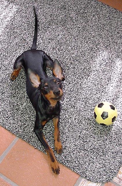 Mit den anderen Spielen kann/darf sie nicht, weil die zu groß sind und sie schon öfters umgerannt wurde.