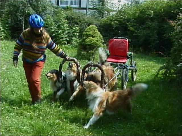 Gestern fragte ich im Forum um Rat wegen des Startgebells. Stefanie kam auf die überaus logisch klingende Idee mit dem Gartenschlauch. Na klar! Der Gartenschlauch liegt doch eh meist neben dem Sacco Dog Cart auf dem Rasen herum. Heute also, nachdem ich den Wagen von seiner Regenschutzdecke befreit und die Zugstangen eingehängt hatte, trug ich nicht nur die Gurte, Geschirre und meinen Sturzhelm herbei, sondern drehte ganz beiläufig auf der Terrasse den Wasserhahn auf. Das Anspannen funktionierte noch sehr zivilisiert und leise. Dann griff ich mit Rechts ganz unauffällig den Gartenschlauch und mit Links Belanas Zugstangenbügel. Beim ersten, wortlosen Schritt voran brach das Gekläff los. Anjin, Arabelle und Belana bellten gleichzeitig aufgeregt drauf los - "Ruh!". Der Gartenschlauch traf zuerst Anjin, dann Belana, Arabelle und nochmals Anjin, die trotzdem weiterkläffte. Während Belana und Arabelle zunächst einen Schritt rückwärts machten und verdutzt die Klappe hielten, brauchte Anjin einen Extraschwall genau auf den Kopf, zwischen die Ohren. Anjin tobte. Sie hüpfte auf und nieder, vor und zurück, nach rechts und links, kam aber weder aus dem Geschirr, noch aus dem "Regen", bis sie endlich Ruhe gab und ich den Schlauch sofort weg von den Hunden auf's Gras richtete. "Fein, Anjin", lobte ich kurz, forderte "Sitz!", gab jedem 1 Trockenfutterbröckchen und versuchte den 2. Schritt. Bis kurz vor das Gartentörchen brauchte ich noch einige Liter Wasser, die ich in kleinen Einheiten auf die Hündinnen verteilte, ohne anzuhalten. Nach jedem Schwall war erst einmal wieder Ruhe. Aron hielt sich zurück und schwieg. Er ist ja nicht doof! Bei den Hündinnen dauerte es, bis unmittelbar nach dem Rechtsabbiegen vor dem Törchen klar wurde, dass ich wieder nur Gartenrunden und -8en vorhatte. Einige Meter weiter forderte ich "Sitz!", rannte auf die Terrasse und stellte das Wasser ab. Als ich wieder kam, gab's wieder eine Runde Leckerlis, bevor es weiter ging. Für den Rest des Tages wurde mein "Ruh!" respektvoll eingehalten. Nach wenigen 8en im Garten durften meine übergossenen Collies wie ihre Geschirre im Wohnzimmer trocknen.