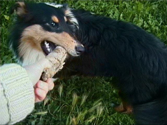 Die wenigen Pausen, die ich mir heute gönnte, verbrachte ich mit meinen Hunden im Garten. Ich legte wie schon oft 4 von 5 Hunden ab um reihum mit einem einzigen zu spielen. Ich versuchte, Arabelle das Nicht-Fallenlassen eines Bällchens, das sie apportiert, zu erklären, indem ich sie vor mir sitzen und den Gegenstand noch einmal aufheben ließ. Besser ging es jedoch mit einer Beißwurst, mit der wir direkt, wenn sie wiederkam, Tauziehen spielten. Anjin macht manchmal auch mit beißwurst den Fehler, dass sie nicht auf kürzestem Weg zu mir kommt, sondern sich die letzten Meter auf einer spiralförmigen Bahn nähert, bis ich den Gegenstand greife. Das mag mit ihrem im Kreis Rennen zu tun haben, das sie zeigt, um uns zu "hüten".