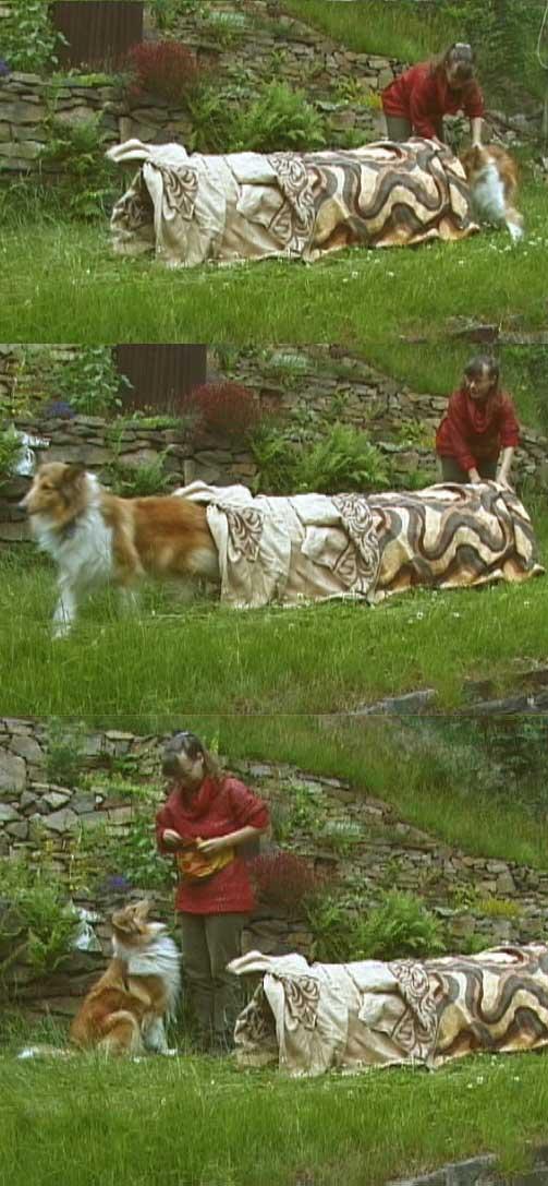 Heute wollte ich wissen, ob meine Jüngsten ängstlich auf eine dunkle Röhre reagieren. Ich wickelte also Wolldecken um unseren Drahtrollen-Tunnel, so dass drinnen das Licht knapp wurde. Es störte keinen meiner Hunde. Anjin und Arabelle waren zwar im ersten Moment abgelenkt oder wollten das Kommando nicht verstehen, so dass ich sie mit der Nase bis unmittelbar vor den Eingang führen musste, liefen dann aber jedes Mal zielstrebig hindurch. Anders und Belana brauchte ich nicht so nah heranzuführen. Aron rannte von der Haustür aus bereits von selbst zur Röhre und demonstrierte, wie gut er auch im Dunkeln "hellsehen" kann - war doch klar, welches Kommando ich geben würde! Nach 6 1/2 gemeinsamen Jahren kennt er sein Frauchen. Anders war der Aufgeregteste und Schnellste. Kaum hatte er das Spielchen begriffen, sauste er immer schneller hin und her durch die Röhre und verkrümelte in seiner Eile einen guten Teil der Trockenfutter-Belohnungen - So ein Streber!
