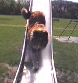 Auf unserer Fahrtour passierte nichts außergewöhnliches. Aron war auch nicht sehr schnell. Belana mußte oft auf den Trainingswagen warten. Gladess war zu Hause geblieben. Sie freute sich darüber, konkurrenzlos fressen zu dürfen. Wahrscheinlich hatte Aron gestern zu wenig gefressen. Er wirkte wenig motiviert. Außerdem war es recht warm und in Bezug auf Kaninchen und fremde Rüden, denen wir hätten begegnen können, eher langweilig. Nachmittags machte ich mit allen drei Hunden einen ausgedehnten Spaziergang. An einer Stelle ließ ich Aron und Belana durch einen Bach schwimmen, während ich die Fußgängerbrücke benutzte. Belana und Aron lassen sich gut fernlenken. Sie verstanden schnell. Ein Stück weiter ließ ich Belana auf einem einsamen Spielplatz ein paar Mal mit Hilfestellung über eine steile, glatte Wippe laufen und Rutschbahnrutschen. Ich machte mir einen Spaß daraus, Aron und Belana auf ungemähten Flächen der Stadt durchs hohe Gras zu lenken. Gladess blieb nah bei mir. So kamen auch Fahrradfahrer und Jogger ohne ängstlich zu werden überall an uns vorbei. Besonders Belana mußte kräftig hochhüpfen, um etwas sehen zu können. Ihre Hopserei sah lustig aus. Leider fingen sich beide dabei unglaublich viele Zecken ein.