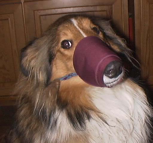 Für Belana habe ich einen Maulkorb genäht. Jeder Hundebesitzer sollte einen passenden Maulkorb für seinen Hund im erste Hilfe-Kasten haben, denn ein verletzter Hund kann vor Schmerz um sich beißen. Außerdem ist ein THW-Erlaß herausgekommen, nach dem Hunde im Mannschaftwagen nur mit Maulkorb zugelassen sind.