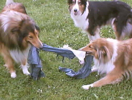 Der Tag war für die Hunde langweilig. Außer ein paar Tauziehspielchen hatte ich keine Zeit für sie. Abends bekam ich einen Anruf. Besuch kündigte sich für die nächste Stunde an. Nachdem ich den Hörer aufgelegt hatte, wendete ich mich den beiden aufmerksam zu mir hoch schauenden braunen Hunden zu, und erzählte "wir bekommen gleich noch Besuch!" ohne davon auszugehen, daß sie es begreifen könnten. Zu meiner Überraschung sausten beide in den Flur und belauerten die Eingangstür, als ob da JETZT jemand reinkommen müßte. Ich beruhigte sie und ging zur Tagesordnung über. Sie blieben jedoch aufmerksam. Als die Hunde eine halbe Stunde später in den Flur sausten, war es soweit. "Jetzt kommt der Besuch", sagte ich, ohne die Anzeichen gehört zu haben, die Aron und Belana bewegt hatten, in den Flur zu rennen. Jedenfalls hatten sie recht. Und da es ein den Hunden vertrauter, lieber Besuch war, werden sie das Wort "Besuch" jetzt wohl erst recht aus allen Sätzen heraushören. Bisher hatte ich "Besuch, Aron, das ist Besuch!" in erster Linie verwendet, um Arons Wehrverhalten Fremden gegenüber abzustellen.